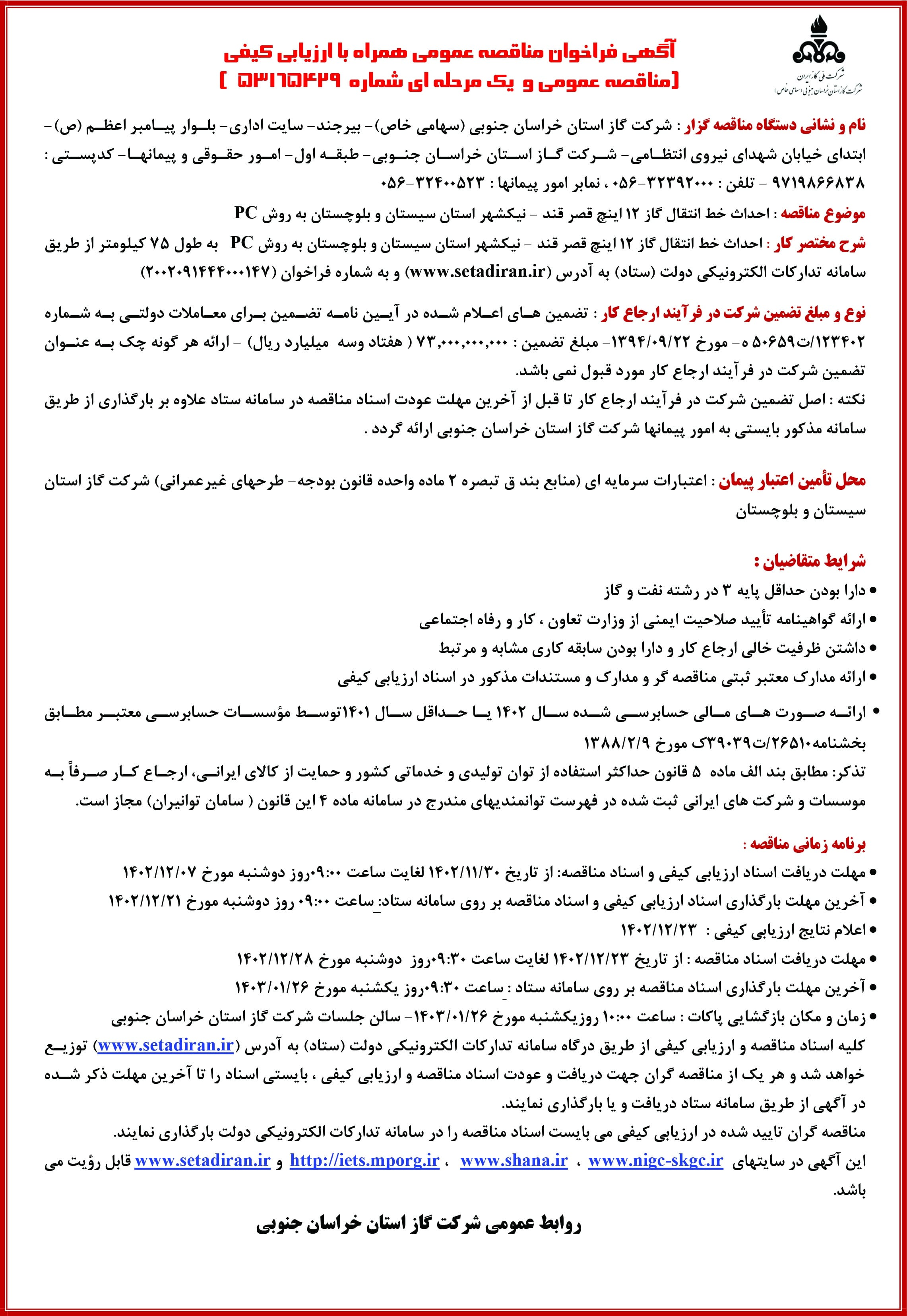 آگهي فراخوان مناقصه عمومي همراه با ارزيابي كيفي (مناقصه عمومي و يك مرحله اي شماره ۵۳۱۶۵۴۲۹)/شركت گاز استان خراسان جنوبي